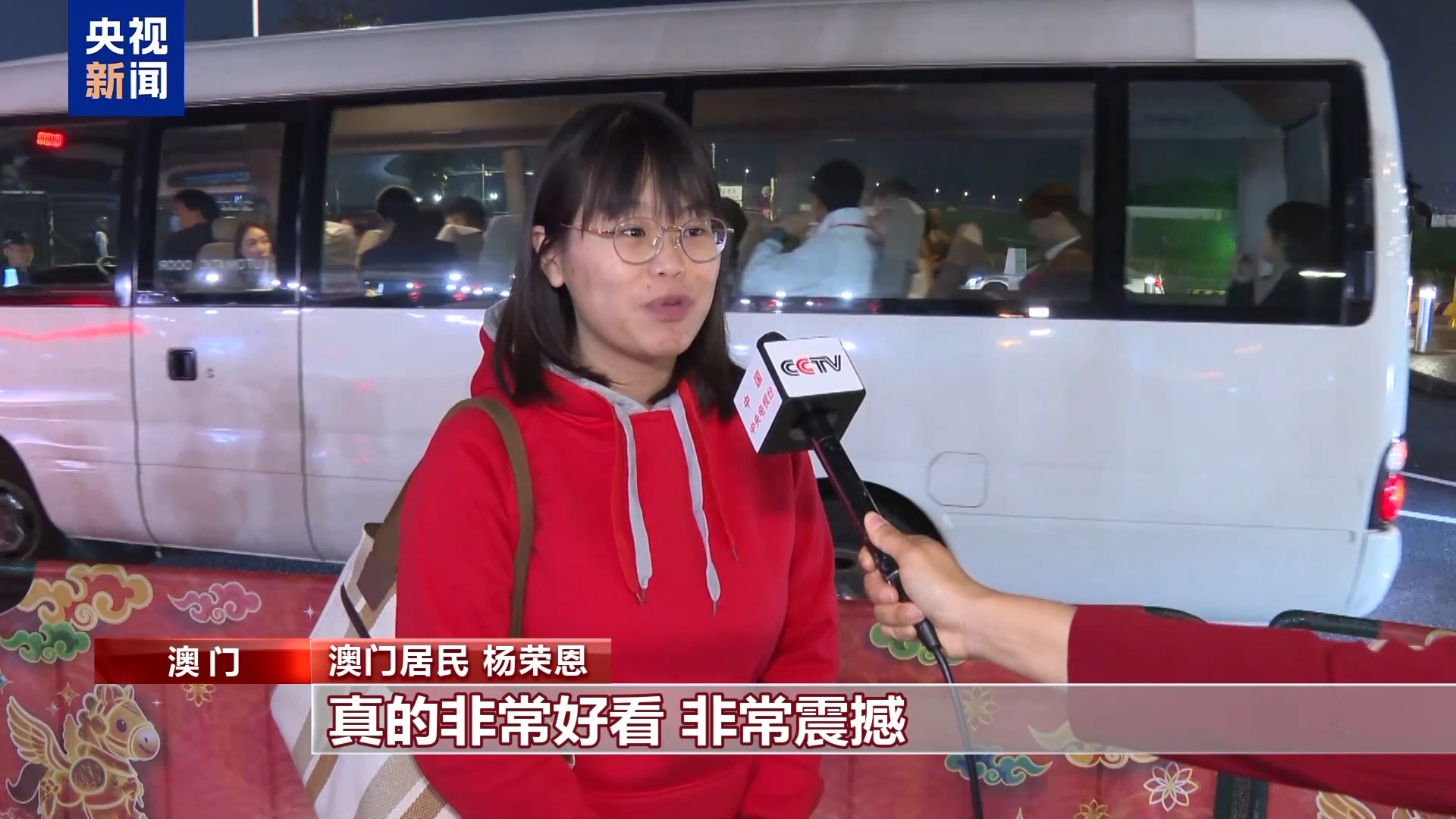 澳门居民 杨荣恩:无人机烟花汇演和花车汇演真的非常好看、非常震撼。我留意到里面有科技创新和传统文化的元素。让我感受到祖国真的很强大。